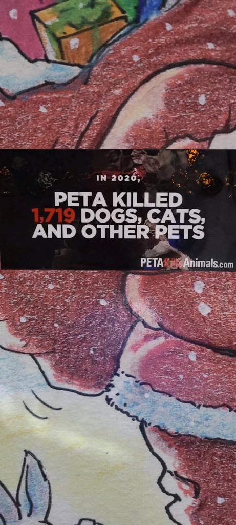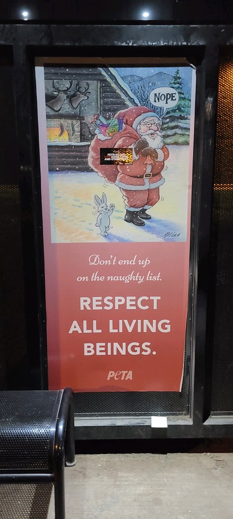 So about a couple months ago, I was at a bus stop in West Virginia and noticed a Christmas-themed PETA advertisement prominently displayed on the backdrop space.
